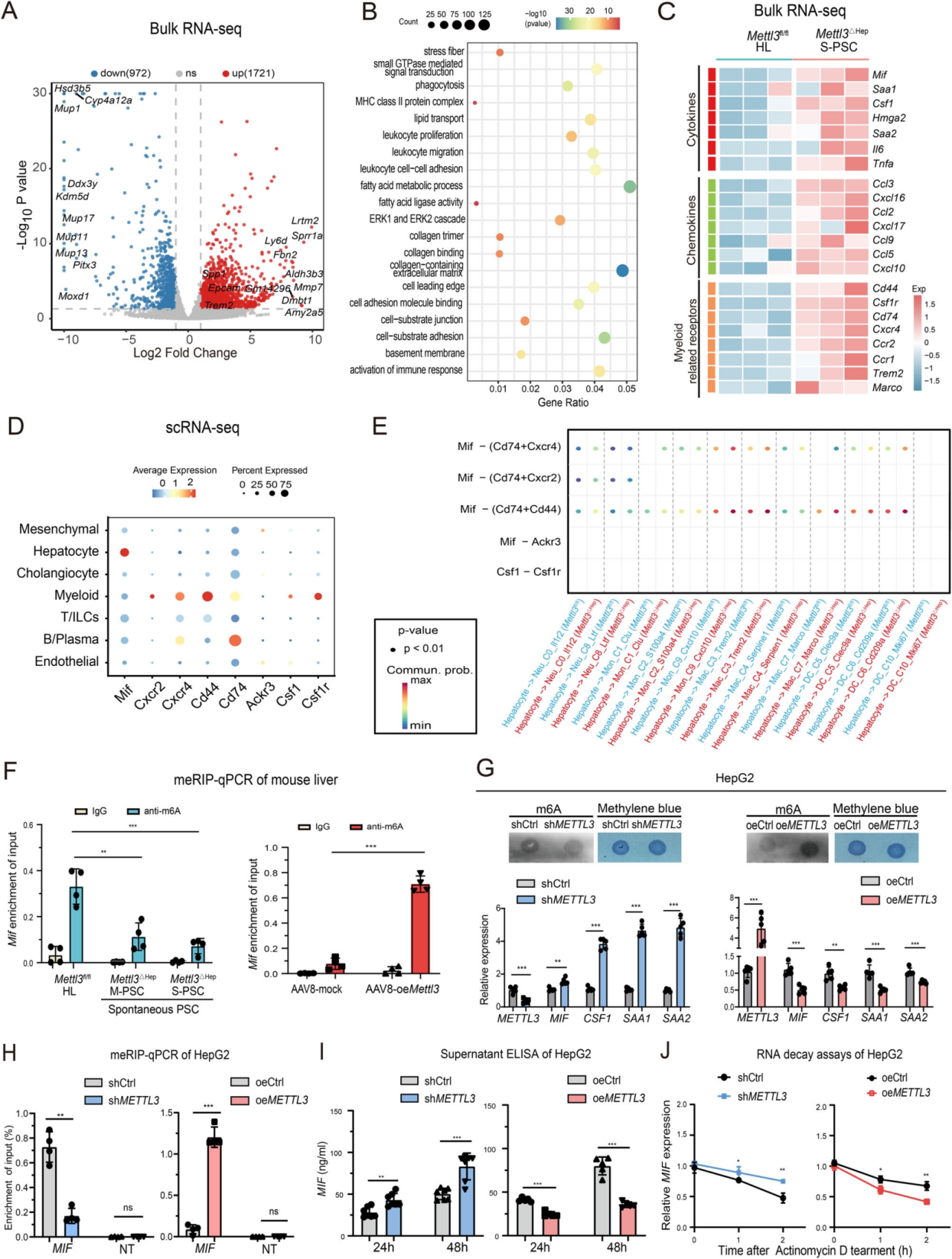 单细胞RNA测序表明Trem2+巨噬细胞是Mettl3△Hep(肝细胞Mettl3缺失)驱动的胆管病微环境重编程的关键介质。通路富集分析揭示了白细胞增殖和迁移、细胞-细胞粘附、细胞-基质连接和粘附过程、脂质转运和脂肪酸代谢激活,批量RNA-seq显示促炎因子显著上调,包括细胞因子(Mif、Csf1、Saa1和Saa2)和趋化因子(Ccl3和Cxcl16)及其相应的受体(Cd44、Cd74和Csf1r)对应物。体外细胞实验证实METTL3通过调节m6A水平来调节MIF、CSF1、SAA1和SAA2的表达,METTL3敲低减少了m6A并上调了这些细胞因子,而其过表达则产生相反的效果。ELISA分析发现HepG2细胞中METTL3敲低增加了MIF分泌,而METTL3过表达显著抑制其表达;放线菌素D测定进揭示了METTL3敲低后MIF和CSF1 mRNA衰期延长,但METTL3过表达后mRNA加速衰减,表明METTL3通过m6A介导的RNA衰减调节MIF和CSF1的稳定性。这些结果表明METTL3通过m6A甲基化调节肝细胞源性MIF和CSF1的表达,从而促进Trem2+巨噬细胞的募集并促进胆管细胞-巨噬细胞串扰,从而促进PSC进展。